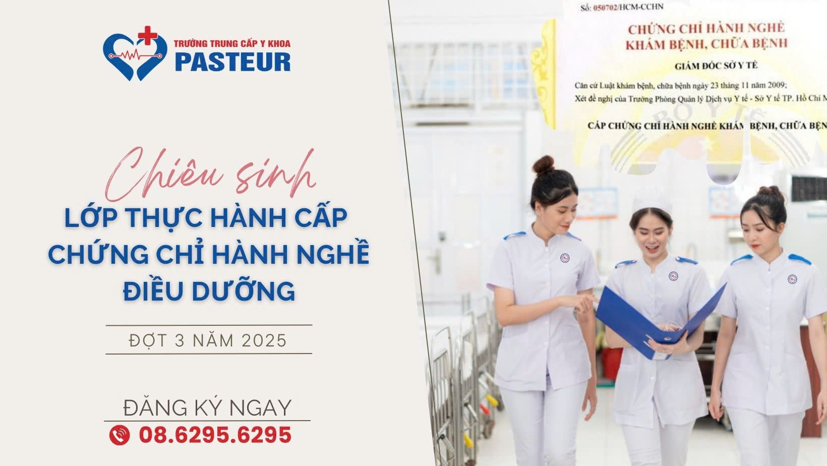 Đừng bỏ lỡ cơ hội tham gia Lớp đào tạo thực hành khám bệnh, chữa bệnh 6 tháng cho điều dưỡng viên để cấp giấy phép hành nghề năm 2025 (Đợt 3) tại Trường Trung cấp Y khoa Pasteur – một trong những đơn vị đào tạo y dược uy tín hàng đầu tại TP.HCM!